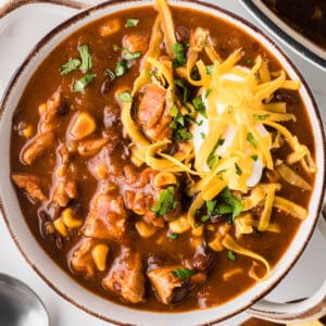 This soup is great served as is, but you can really kick this dish up a notch with adding these additional toppings to your bowl. Serve with sour cream, shredded cheese, tortilla chips and cilantro on top.