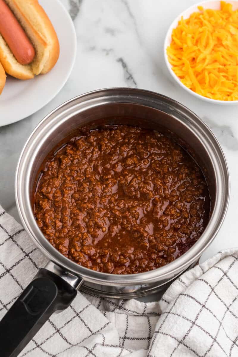 - Optional: serve over a hot dog and top with diced onions and shredded cheese.