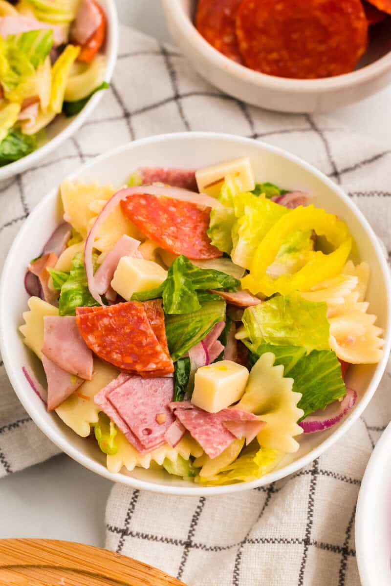 Take your favorite meats from an Italian Sub and add some bowtie pasta, lettuce and other ingredients and toss in Italian Dressing.
