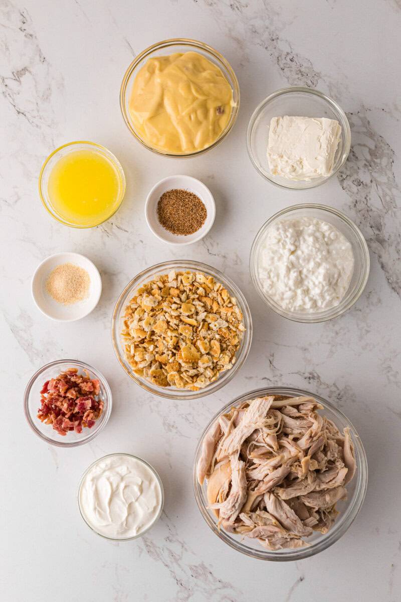 Start by mixing together all the wet ingredients and seasoning together. Mix in the chicken next. Spread the casserole mixture on the bottom of your casserole dish. Spread the bacon crumbles on top of the casserole mixture. Crumble the Ritz Crackers and mix them with melted butter to make the topping. Spread the cracker topping across the whole casserole. Bake and enoy!