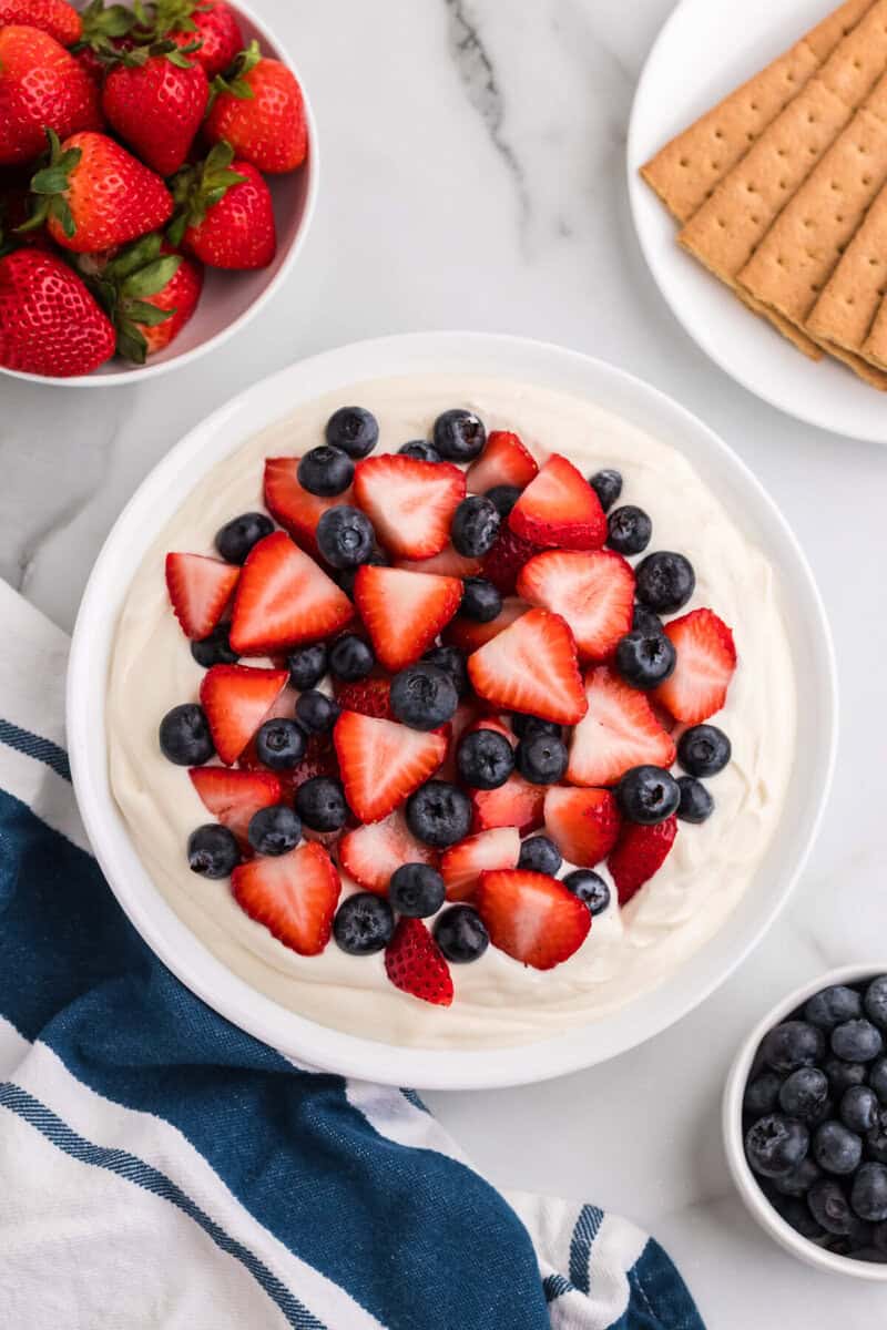 - Remove from mixer and add to a serving bowl. Top fresh strawberries and blueberries. Serve graham crackers for dipping!