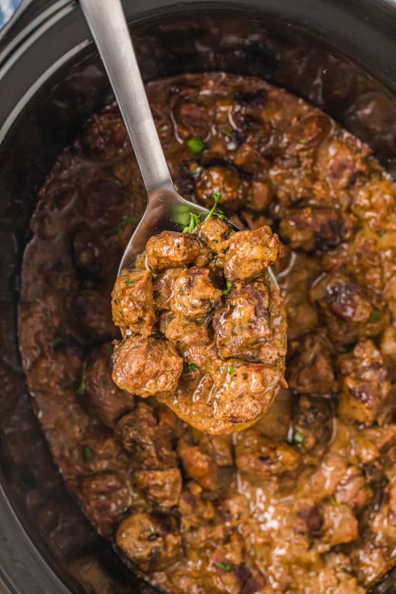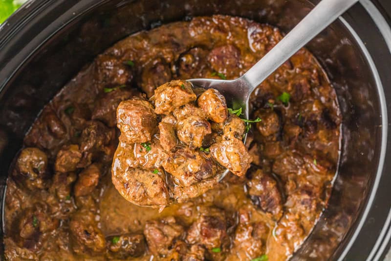 Slow Cooker Beef Tips are tender, flavorful, and simmered all day in a rich, savory gravy. An easy comfort food dinner perfect over mashed potatoes, rice, or noodles.