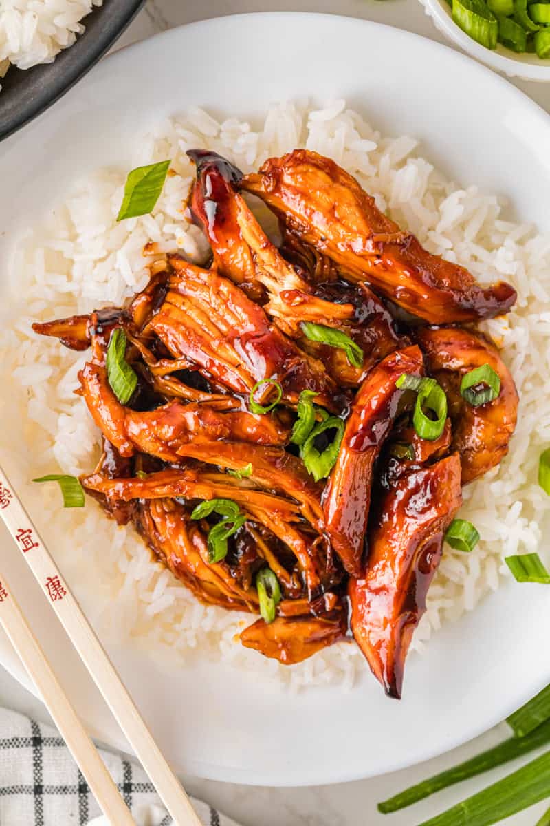 - Use a fork to lightly shred chicken into small bite-size pieces. Top onto cooked rice and serve.