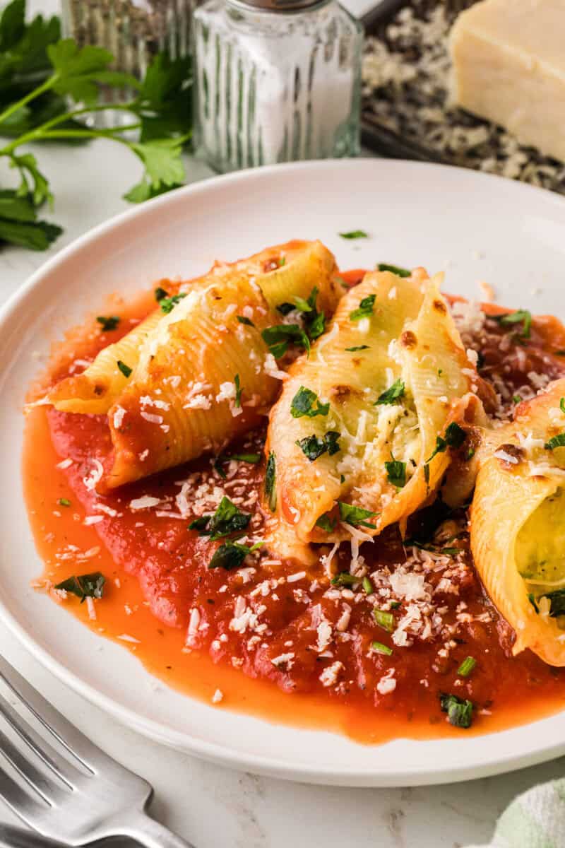 Pasta shells stuffed with a ricotta cheese filling and baked in a red sauce make this the perfect dinner. Serve with a salad and garlic bread and enjoy!