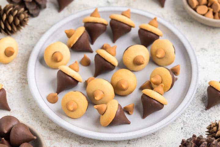 Acorn Cookies are a cute little treat that double as dessert and decoration. They’re made with simple store-bought ingredients and come together quickly, making them a fun project to do with the kids before the big meal. Scatter them on a platter or around your dessert table for a festive touch.