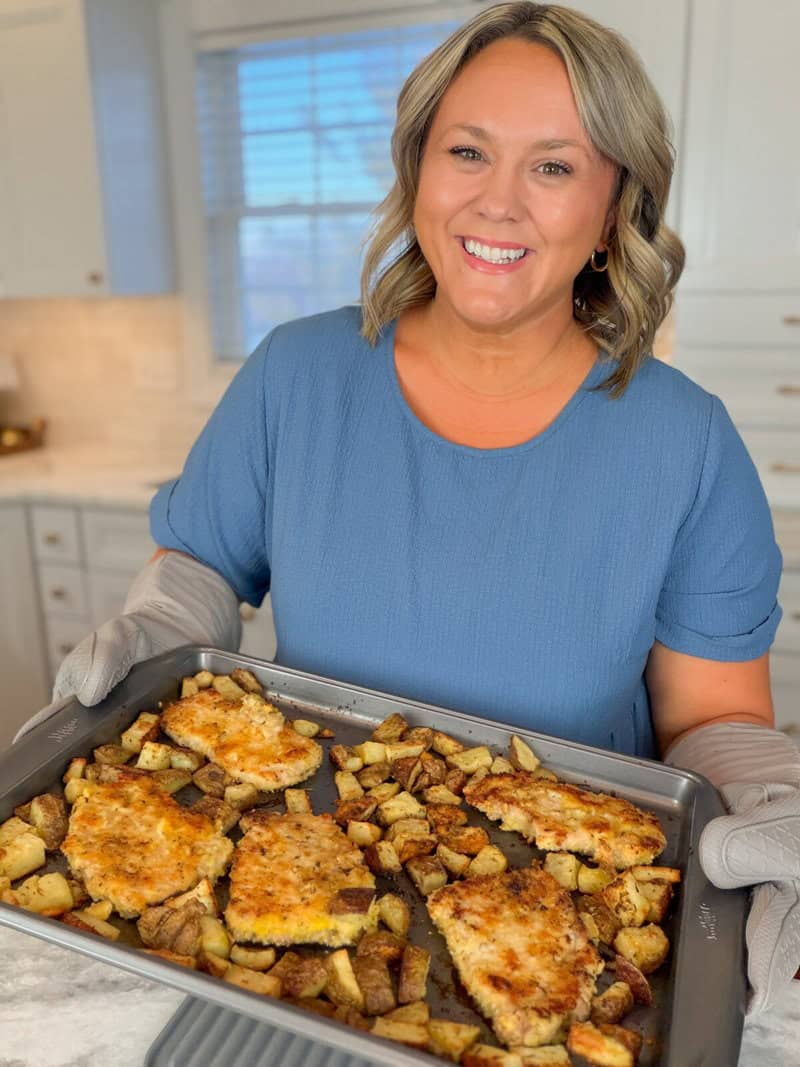 This is one of those easy dinners that keeps cleanup minimal. Everything cooks together on one pan, giving you tender pork chops and roasted veggies with lots of flavor and very little effort.